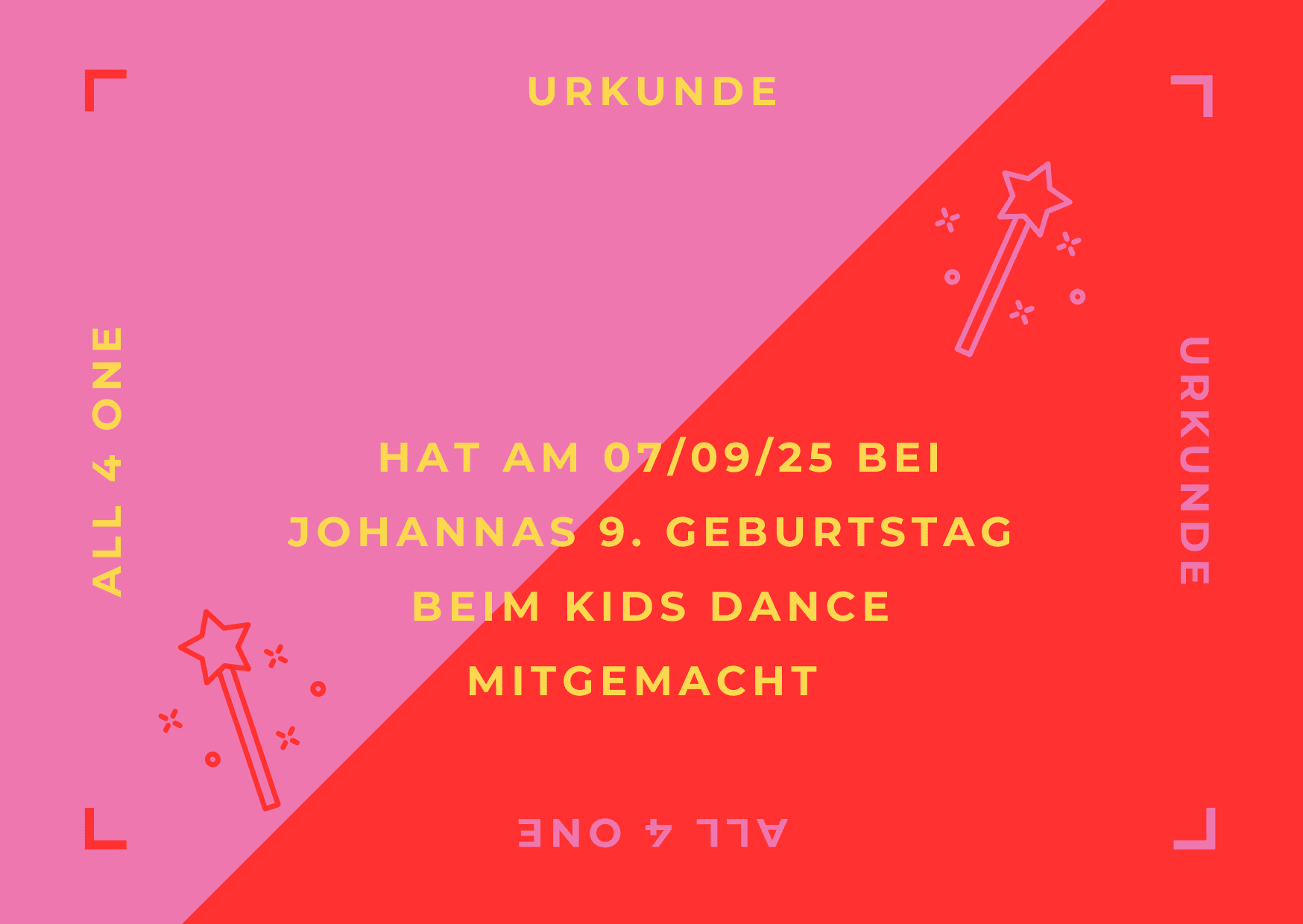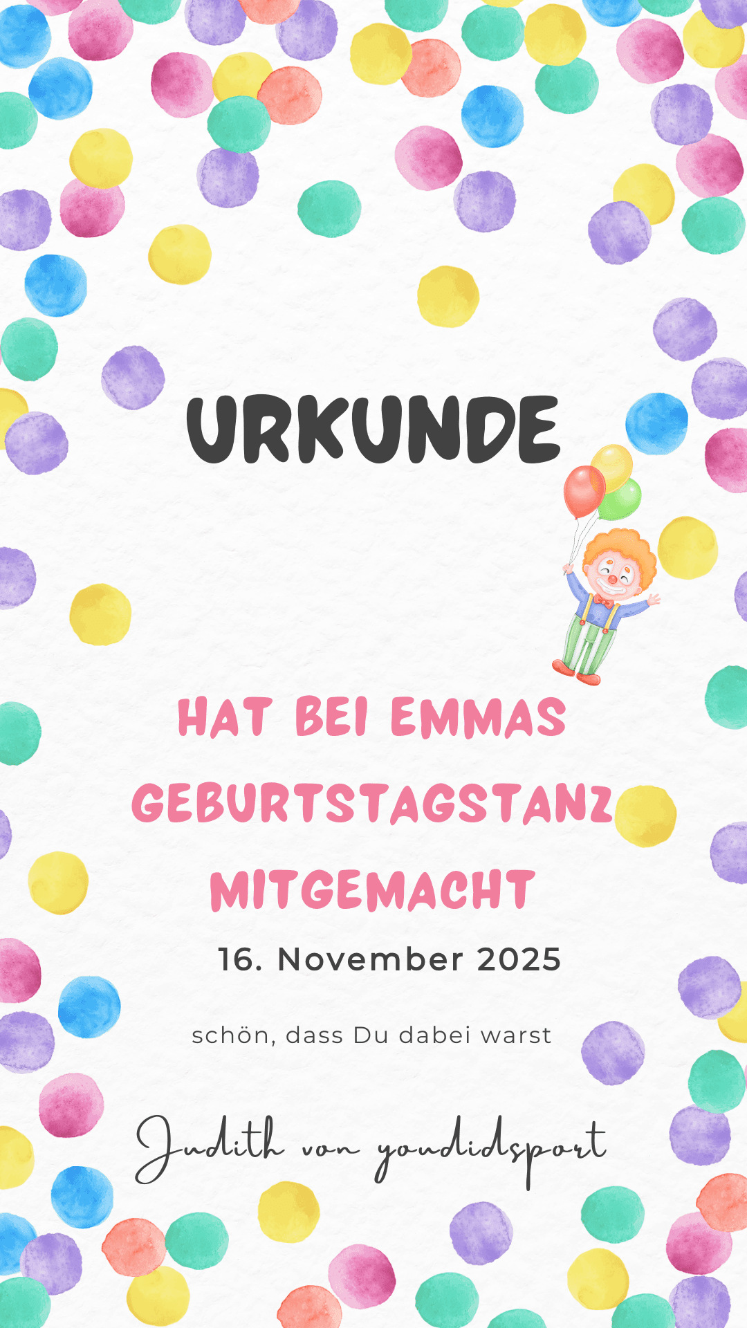 Judith hat am 7. Geburtstag unserer Tochter eine tolle Choreografie mit den Mädels einstudiert – mit Accessoires, Urkunden und viel Begeisterung! Das Tanzen war ein echtes Highlight. Absolut empfehlenswert!
